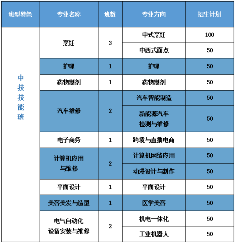 2026年我校招生指标为750人,有9个热门招生专业,包括:烹饪、护理、药物制剂、汽车维修、电子商务、计算机应用与维修、平面设计、美容美发与造型、电气自动化设备安装与维修等,班型包括:普通技能班、高职高考班(3+证书)。